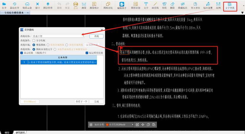 3.利用【文字查找】功能,输入关键词"给水干管"快速定位管材与连接方式:给水干管采用钢塑复合管,丝接。给水立管及室内支管采用冷水用无规共聚聚丙烯PP-R管,管系列选用S5,热熔连接。