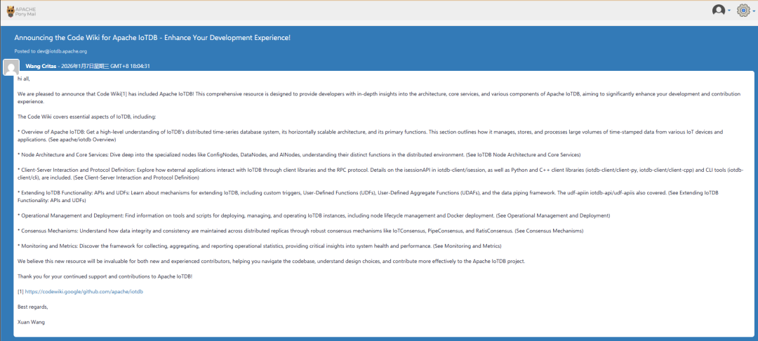 Apache IoTDB 邮件列表分享被 Google Code Wiki 收录的信息