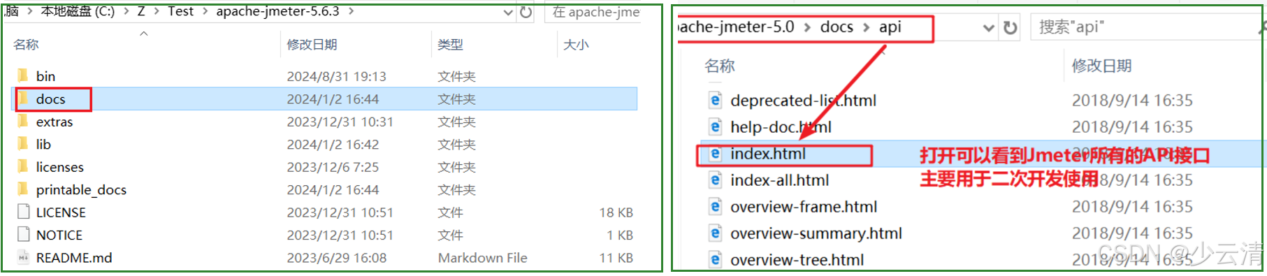 docs目录:是JMeter的api文档,用于开发扩展组件。