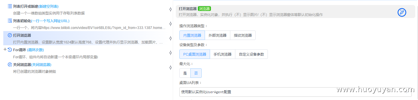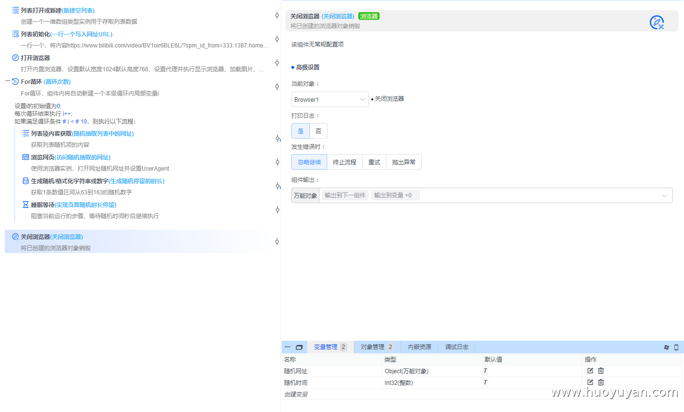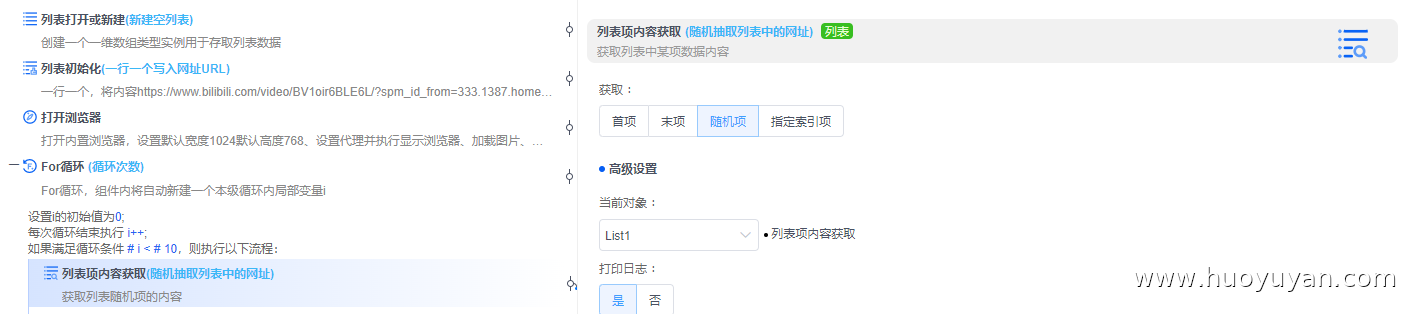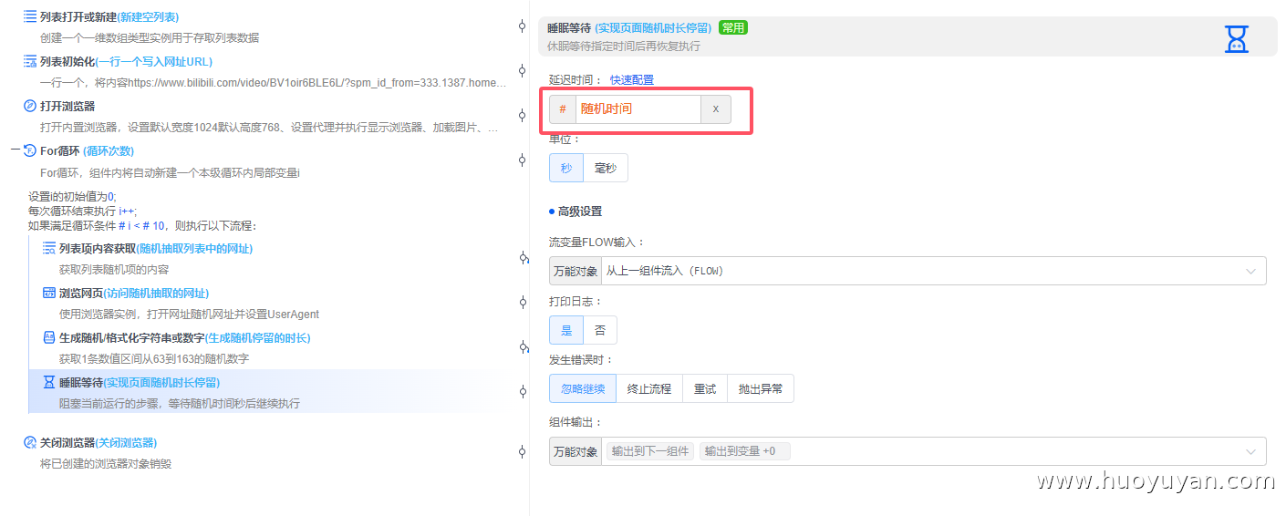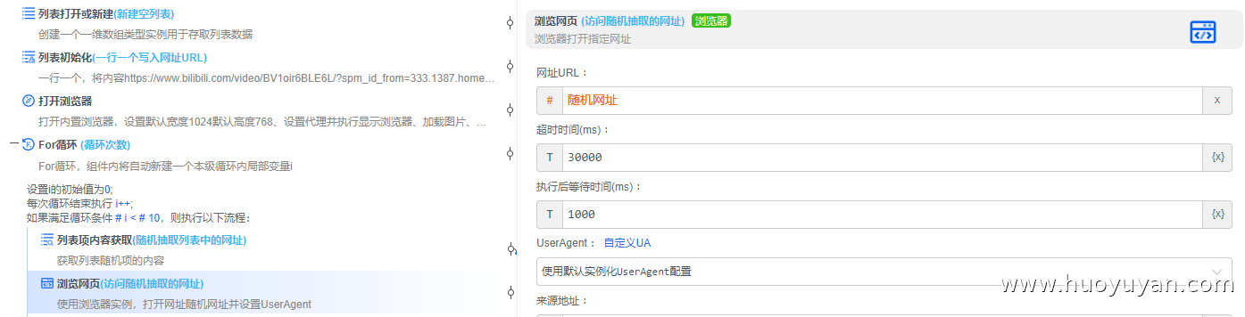 本案例是基于火语言搭建的贴近真人行为的自动化方案,支持批量网址的随机抽取访问、随机时长停留与循环执行,适用于网页访问测试、轻量内容核验等场景。