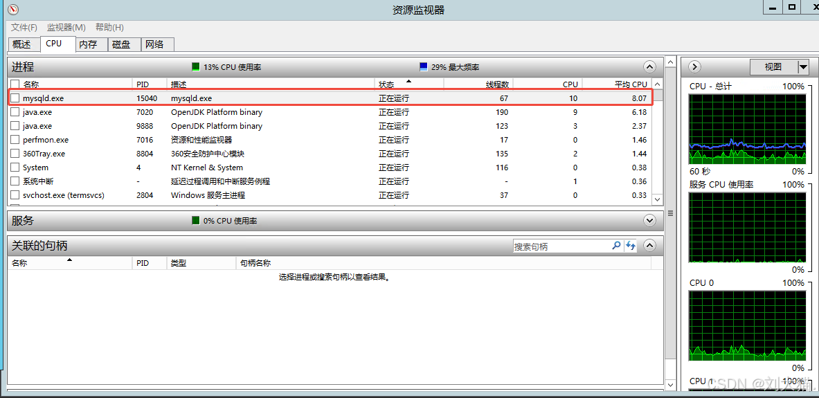 重启后发现CPU占用率立刻降下去了,说明问题就出在这个服务上(即:说明是某个sql导致的)。到这一步说明有2个排查方向导致的: