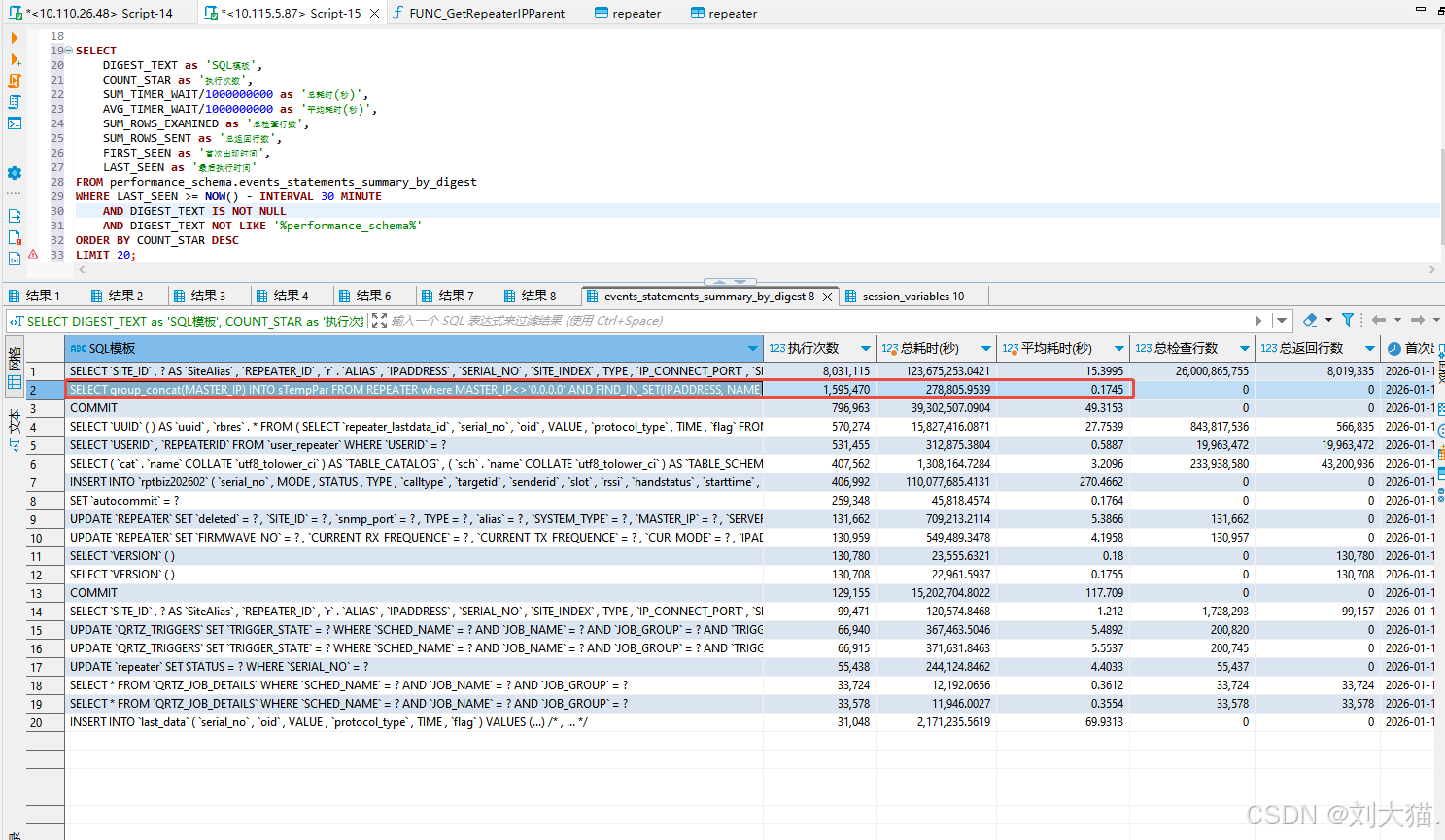 重复执行了这个sql好几次,发现这条红框的每次都有它,感觉它执行的很频繁。继续执行其他命令,查看近半小时哪些sql执行的频率比较高。