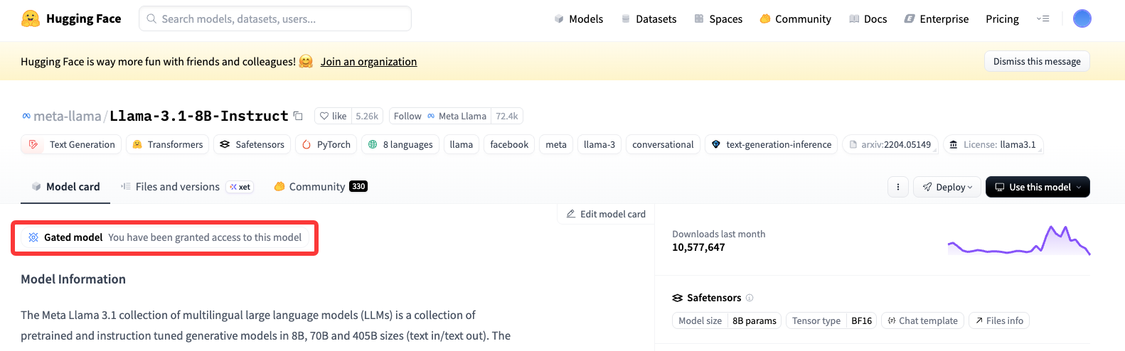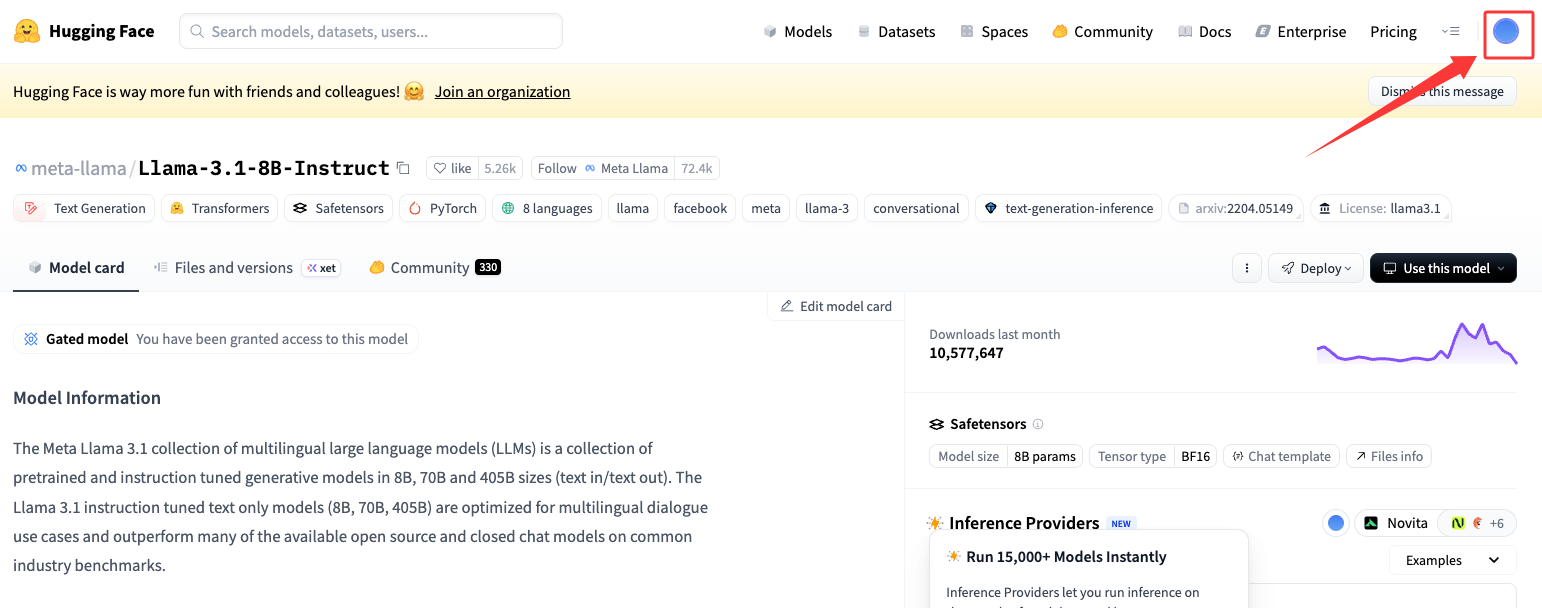 当再次访问Meta的Llama-3.1-8B-Instruct模型在Hugging Face上的官方仓库,看见"Gated model You have been granted access to this model"字样,也说明申请授权成功。