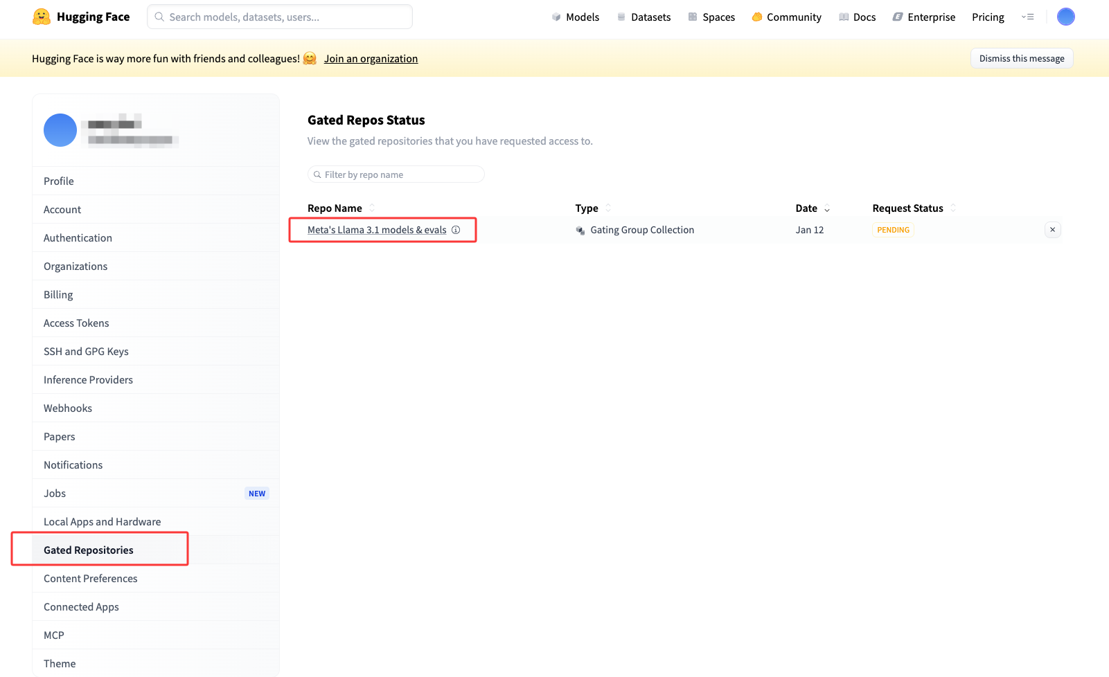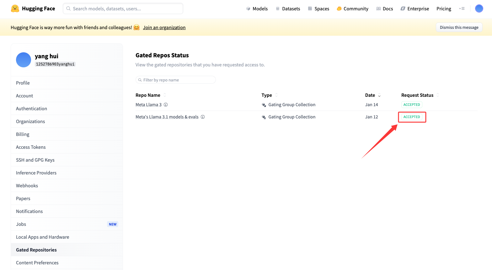 - 3、进入「Gated Repositories 」,就可以看见 申请的
