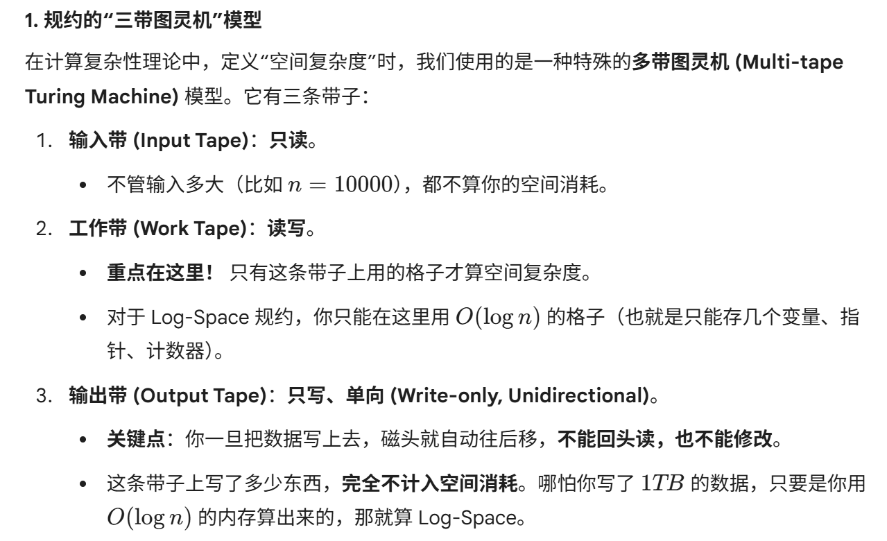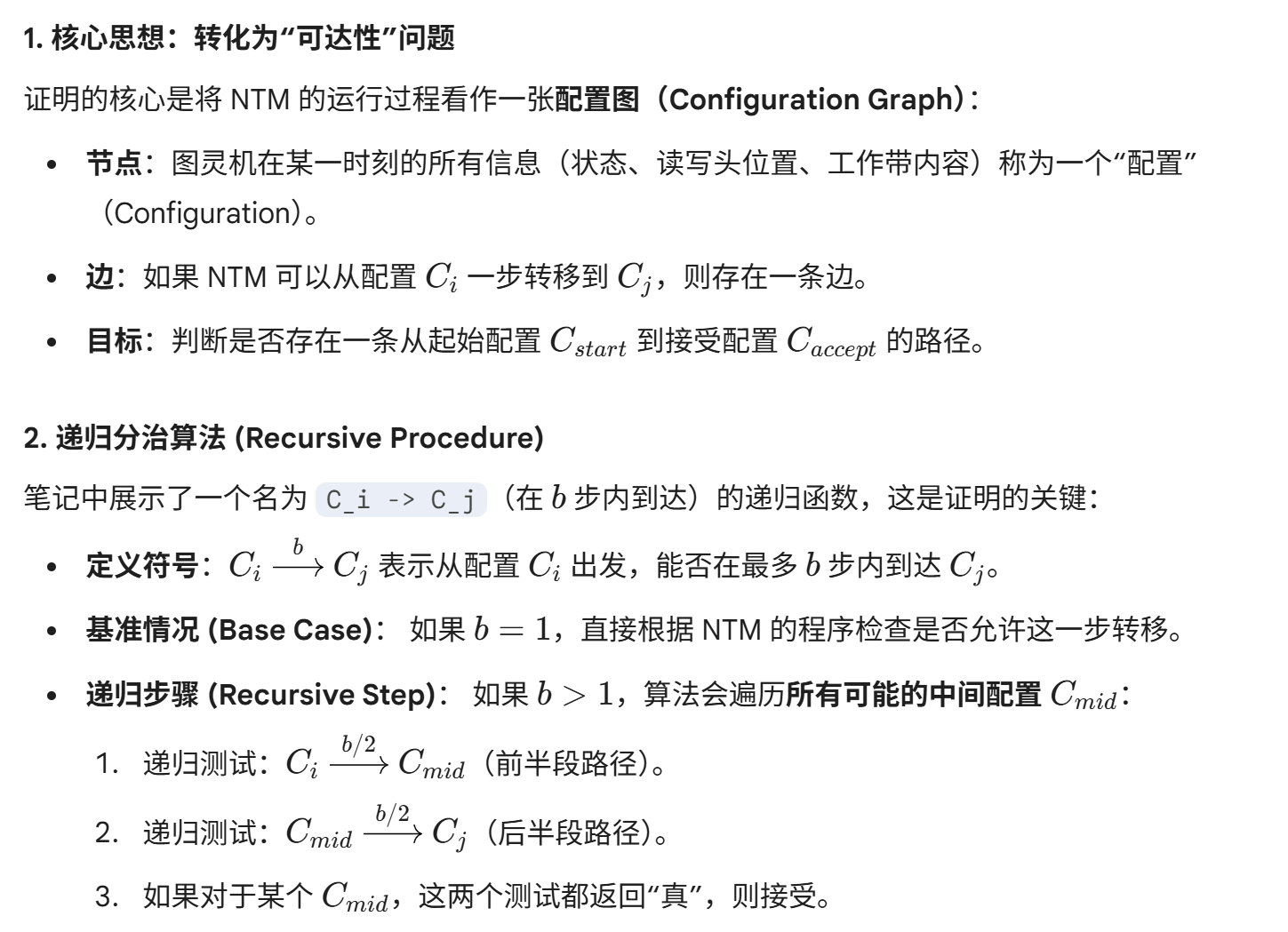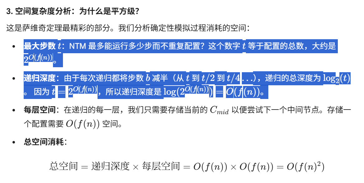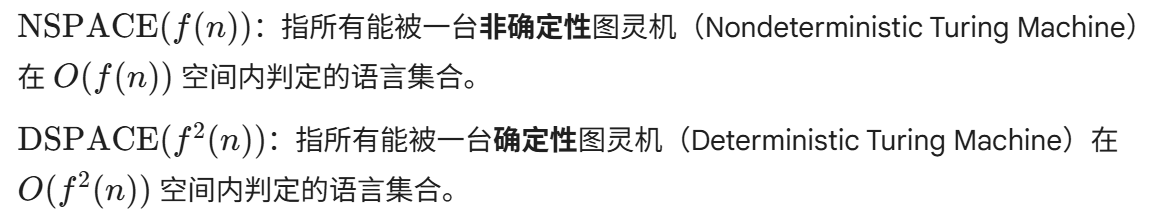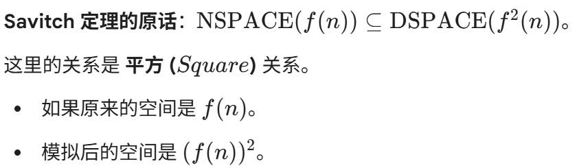 NP包含于NPSPACE: 为了模拟 NP 中的++非确定性猜测++ ,你可以用确定性算法尝试所有可能的赋值或路径 。虽然这需要指数级的 时间,但只要你一次只尝试一种情况,用完后释放空间再试下一种,总空间消耗依然是多项式级别的 。To simulate nondeterministic guessing in NP, you can use a deterministic algorithm to try all possible assignments or paths. Although this requires exponential time, as long as you only try one case at a time and release the space before trying the next, the total space consumption remainsat a polynomial level.【空间复用规则Spatial reuse rules】