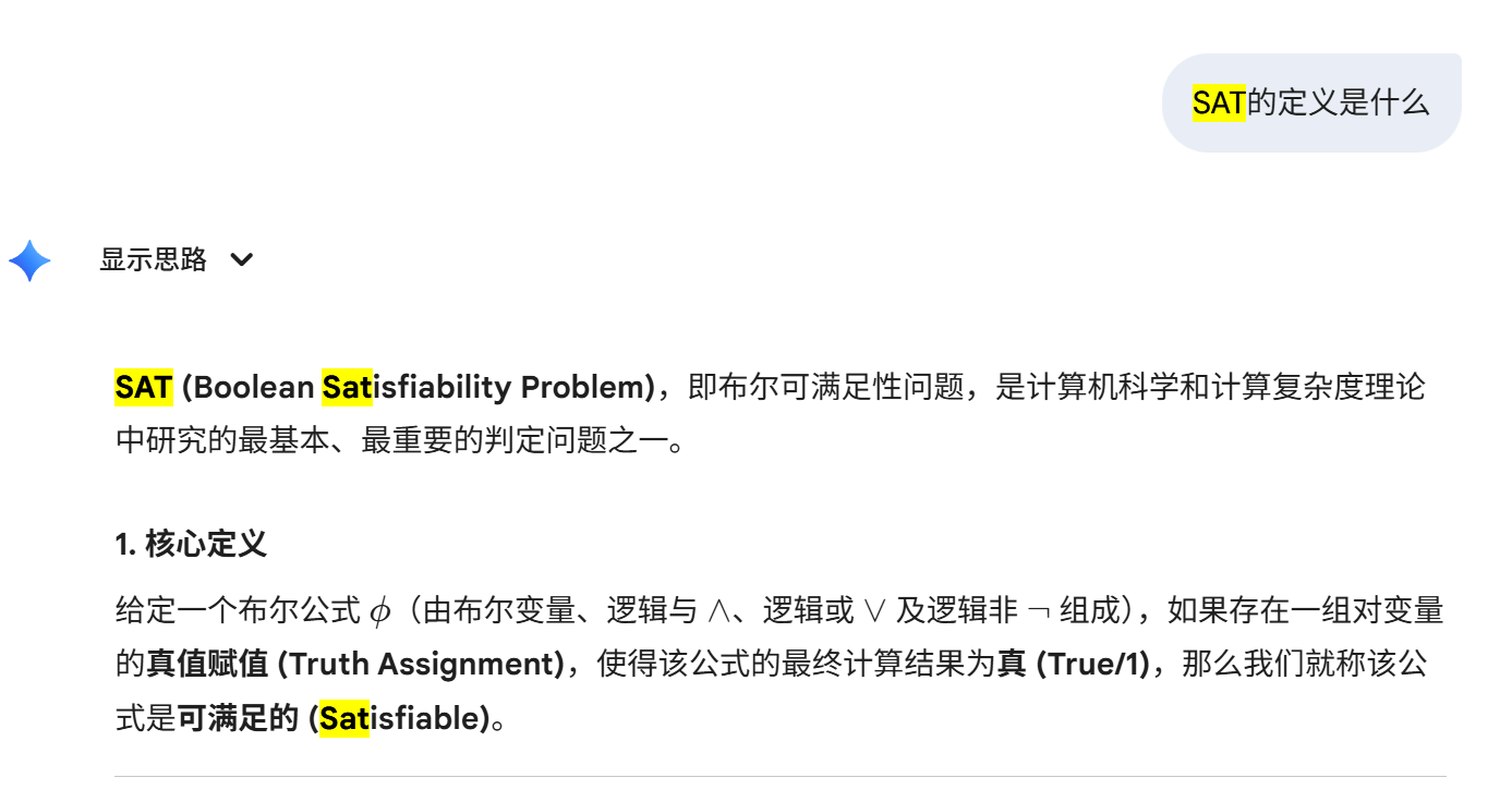 验证:代入这组赋值,验证器检查在该赋值下,公式中的每个子句是否至少有一个文字为真。