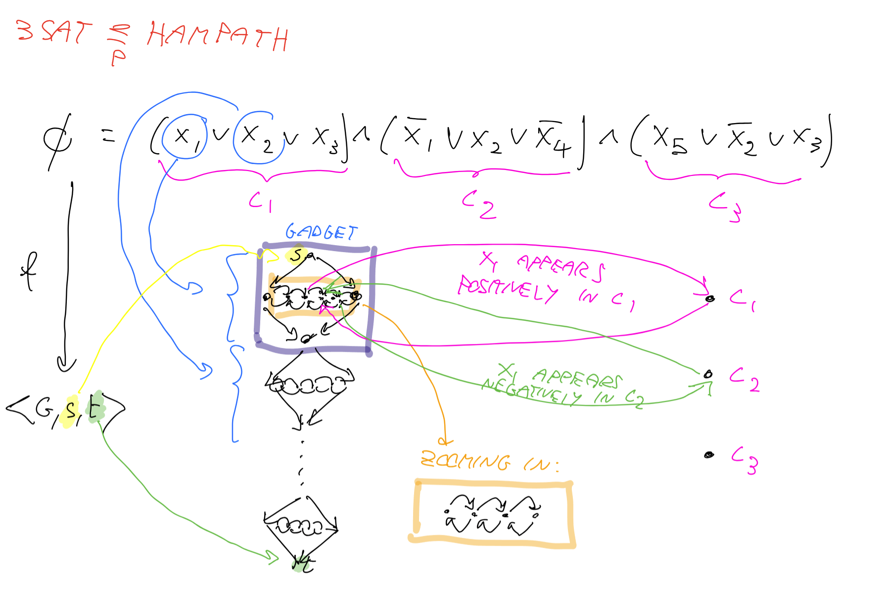 - 如果一个变量在子句中文字为真,那么就从一个节点连线到c,再从c连回这个节点的右边的下一个节点。
