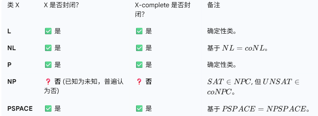 这五大类中,只有NP不知道是否对补集closed,其他都是:X和X-complete都是对补集closed!