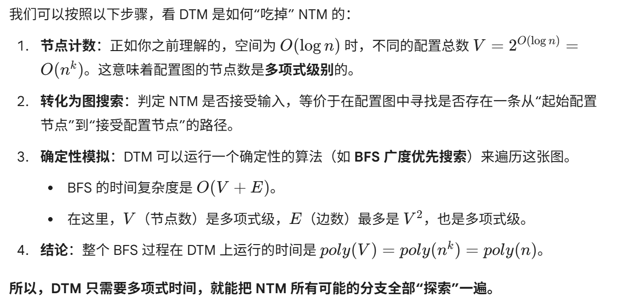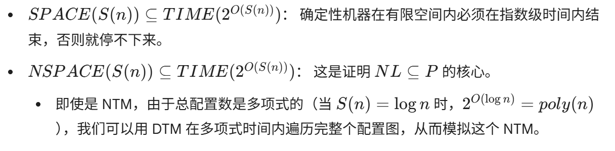 **NL包含于P:✅**消耗空间是S(n)的图灵机最多消耗的时间是2^O(f(n)),因此对数空间消耗的时间是多项式级别的。
