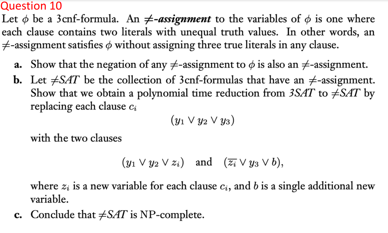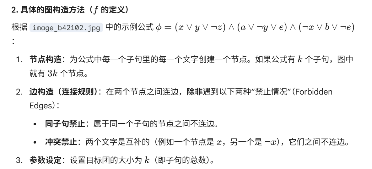 ⚠️注意上面第二问(b),证明规约,那么正向和反向都要证明成立,也即也要证明!=SAT车成立可以使得3SAT成立;而证明c,要先说明b的规约方法是多项式规约