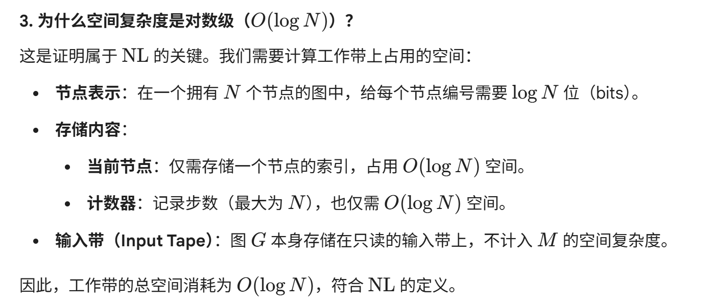 证明 PATH 问题∈NL :先给出一个证书:s 到 t 的一条路径,然后我们可以在对数空间内内验证这个路径:存储当前节点索引和步数计数器(上限为 n),其消耗空间是对数级别的,