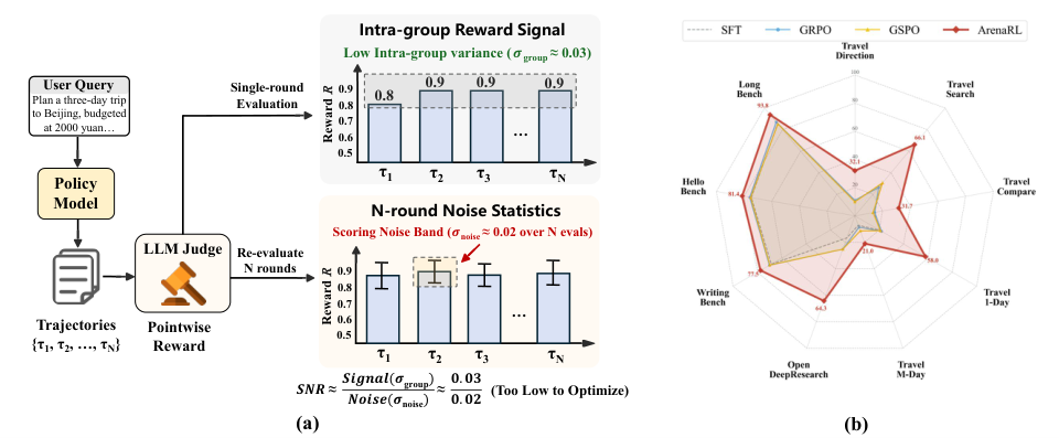 图解:左侧展示点式评分出现"评分集中 + 噪声不低"的现象,信噪比极差;右侧对比显示 ArenaRL 在多个开放式任务上显著优于 SFT/GRPO/GSPO。