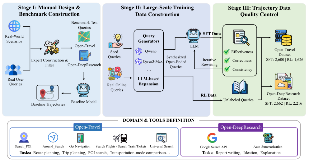 图解:基准构建流程分三阶段:数据收集、训练数据扩展、质量控制,形成可用于 SFT + RL + 评测的完整闭环。