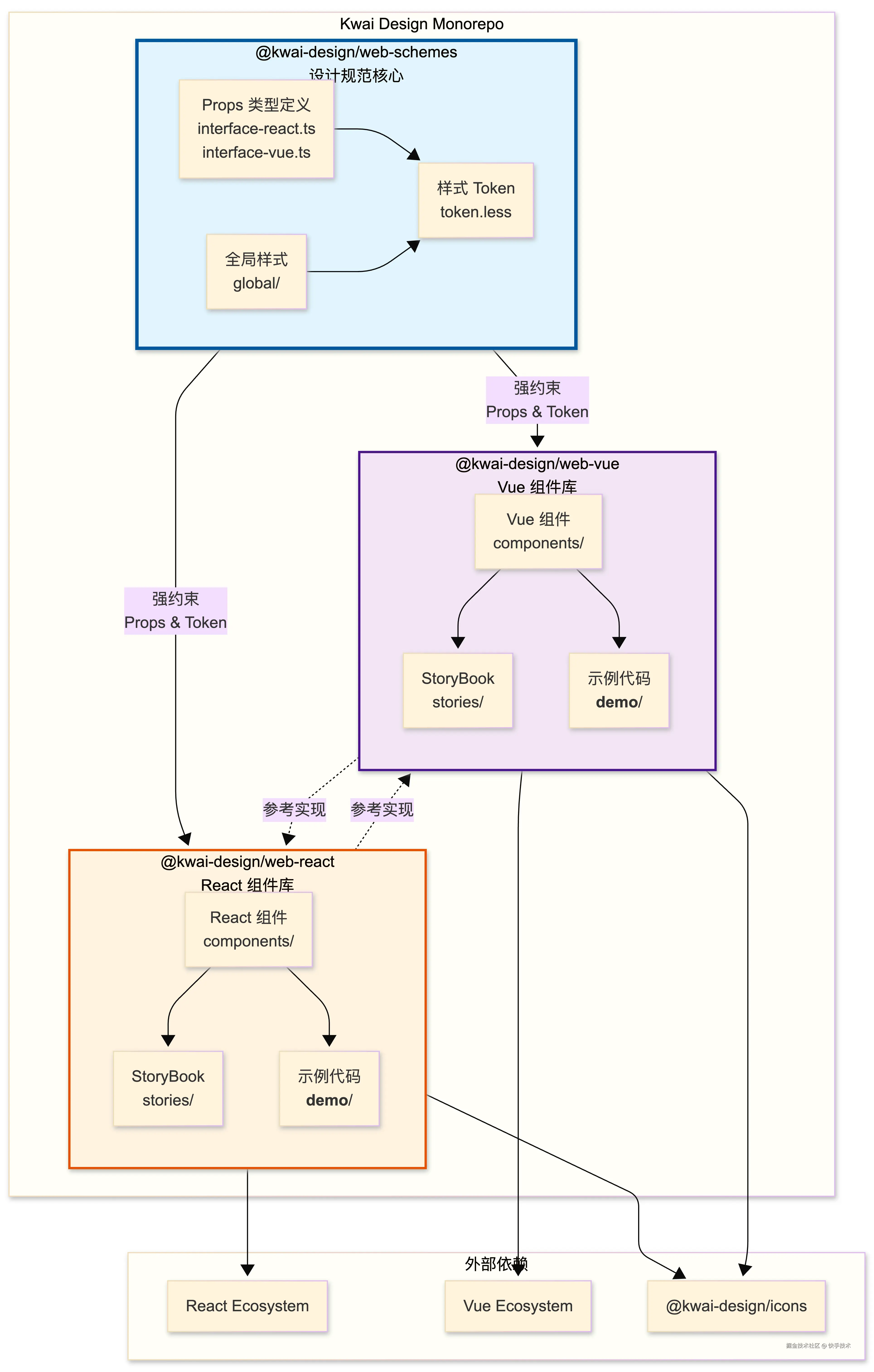 为了从根源上确保 Vue 与 React 技术栈在视觉与 API 基础上达成一致。为此,我们首先建立了统一设计变量(Design Tokens)层 ,将颜色、间距、字体等所有视觉变量统一定义,供 @kwai-design/web-vue 和 @kwai-design/web-react 共同引用,从而在源头上保障了视觉一致性。同时,我们创建了独立的 TypeScript 定义包 @kwai-design/web-schemes,作为双技术栈组件 API 的统一入口,并通过工具链实现强制对齐,彻底杜绝了 API 层面的分叉。历时三个月,我们最终攻克了双技术栈底层样式与类型系统隔离的难题,成功构建出 API 同源、视觉同构的 React 与 Vue 组件库基础框架。