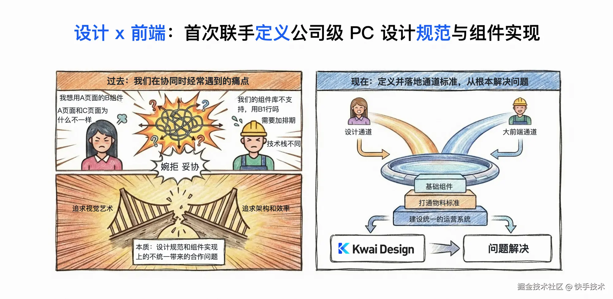 立项之初,我们对直接引入的业界优秀设计方案进行了深入评估。这些方案虽在通用场景下表现优秀,却难以完全适配快手独特的业务与技术生态。因此,我们决定从真实场景出发,构建一套完全贴合快手需求、并能伴随业务共同演进的设计与研发体系------KwaiDesign 由此诞生。