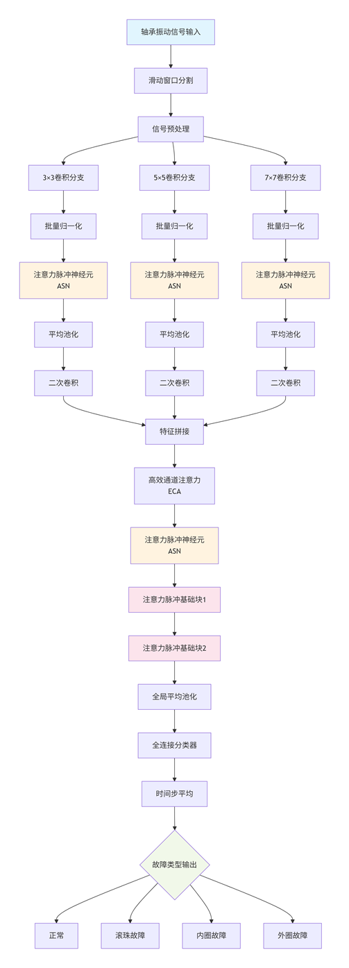 算法首先对原始的轴承振动信号进行预处理,通过滑动窗口将连续的振动信号分割为固定长度的信号片段。接着,算法采用多分辨率特征提取策略,通过三个并行的卷积分支分别使用3×3、5×5和7×7三种不同尺度的卷积核对信号进行初步特征提取,每个分支都包含卷积层、批量归一化层和注意力脉冲神经元,在脉冲神经元中模拟生物神经元的膜电位积分、脉冲发放和重置过程,将连续信号转换为脉冲序列,随后进行平均池化降维和第二次卷积操作以提取更深层次特征。三个分支提取的特征经过拼接后,通过高效通道注意力模块对通道特征进行重校准,增强重要特征通道的权重。处理后的特征输入到注意力脉冲神经元中进行脉冲编码和时空动态处理,模拟生物神经网络的信息传递机制。随后,特征依次通过两个注意力脉冲基础块进行深层特征提取,每个基础块都包含卷积操作、批量归一化、通道注意力、空间注意力和脉冲发放等多个步骤,并通过残差连接保持梯度流动。最后,通过全局平均池化将时空特征压缩为固定维度的特征向量,通过全连接层将特征映射到故障类别空间,得到初步分类结果。由于网络处理了多个时间步的脉冲序列,最终将各个时间步的输出进行平均,整合时间维度上的信息,形成最终分类决策。整个训练过程使用交叉熵损失函数计算预测误差,通过反向传播和替代梯度法更新网络参数,采用学习率衰减策略优化训练过程,实现端到端的轴承故障诊断。