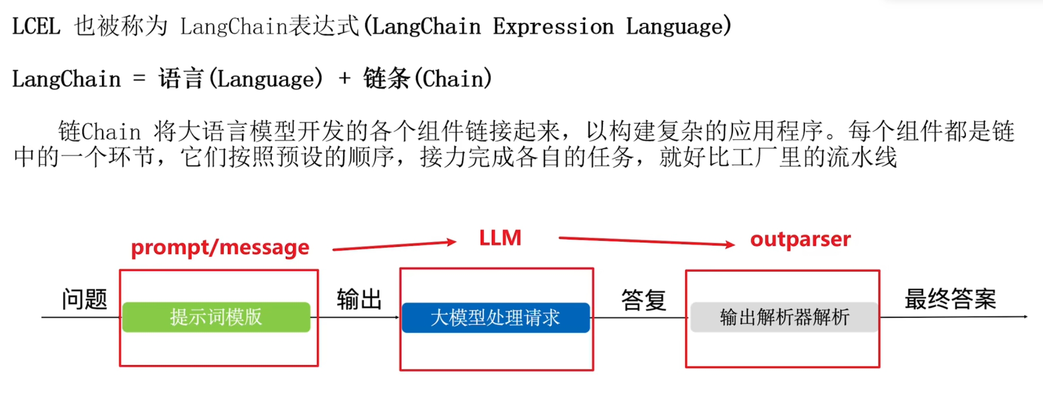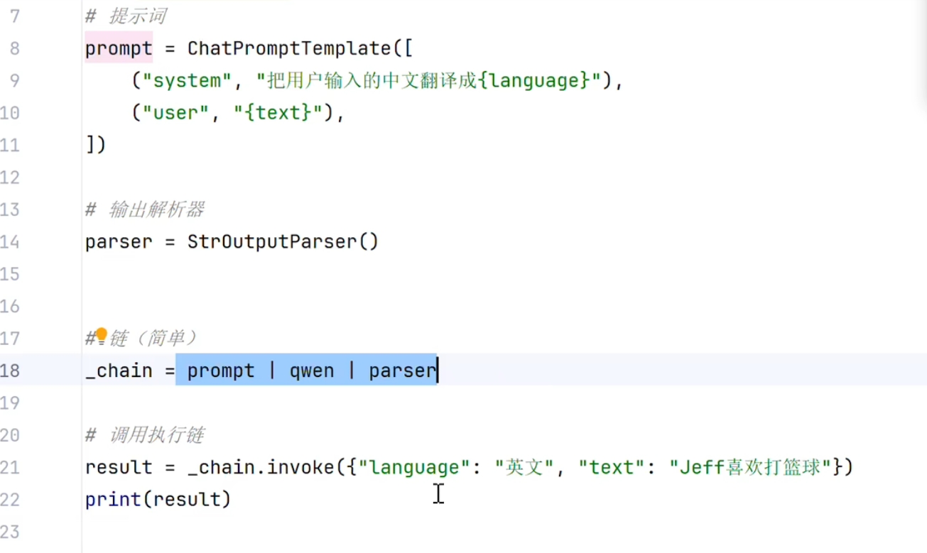 **说明:**这里通过一个提示词的模板,然后动态传入不同的提示词,并使用一个解析器将最后的结果转为字符串。链的说明:_chain = 将提示词 | 大模型 | 解析器,通过一个管道"|"将提示词,大模型,解析器串在一起,实现最终的功能,减少了不必要的代码,简化代码结构和中间变量。