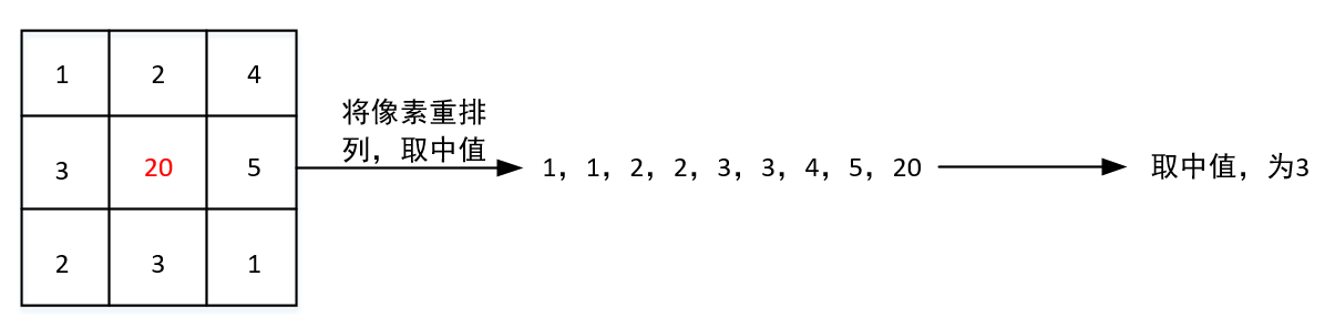同前面所讲的均值滤波相类似,中值滤波也是取当前像素点周围的N x N窗口,取这些值的中值作为当前像素经过滤波后的值。