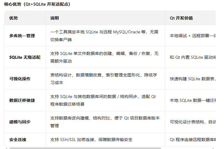 ✅ 适用场景(Qt 开发 100% 匹配):Qt 桌面软件(本地数据存储、配置存储、业务数据存储)、嵌入式程序、移动端 App、小型工具类软件;