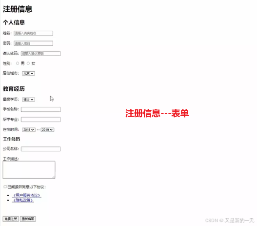 <!-- 注册信息(个人信息/教育经历/工作经历)一起传,所以写在form标签里面,方便一起发送数据:
