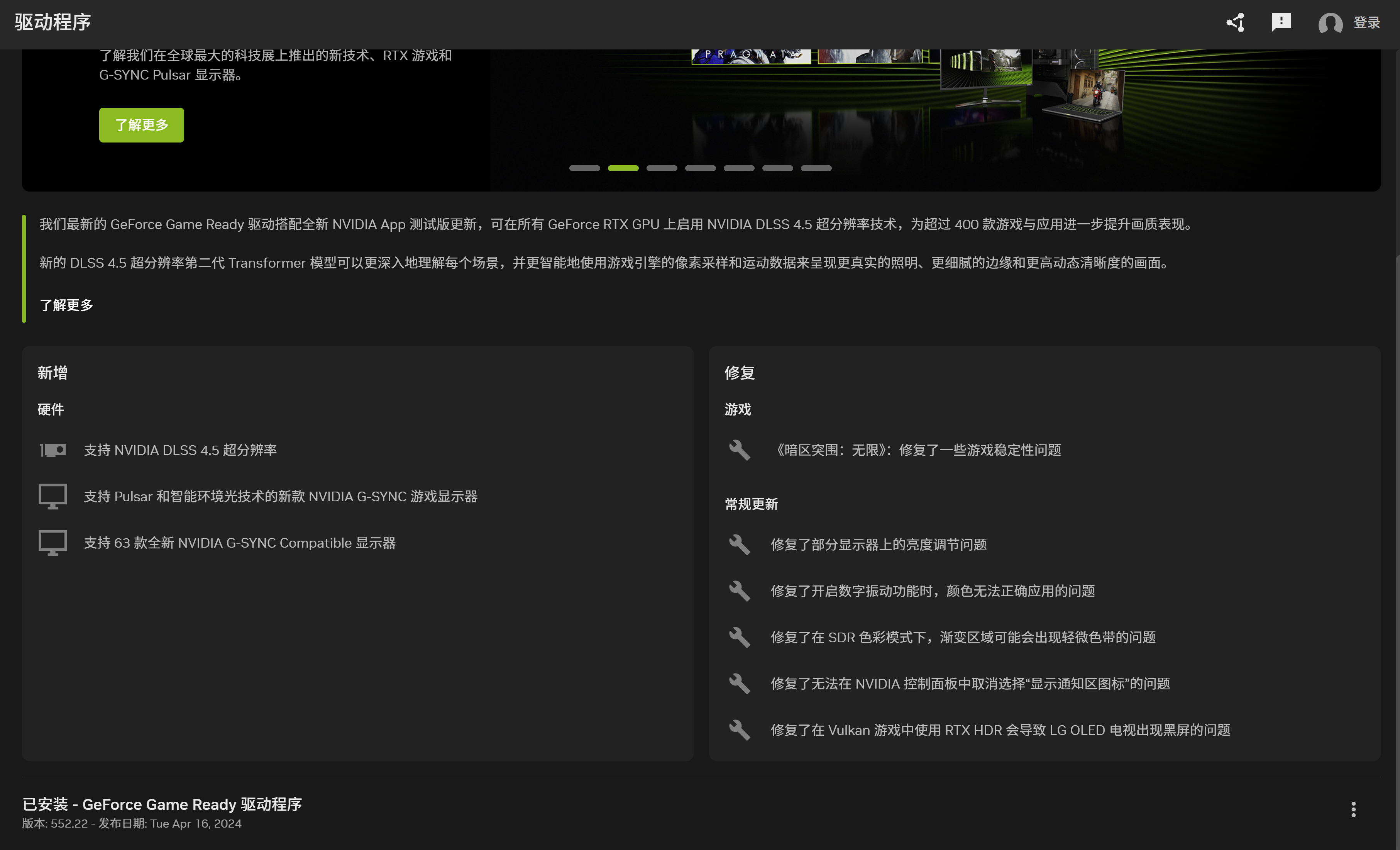 首先我们需要手动下载一个合适版本的显卡驱动,我从最新的591,到之前的580和571都试了一下,都有这个问题。只有早期的552版本可以正常运行。但是Nvidia App里边没有这个版本可以回退,官网中文版也只有那几个固定的新版本,于是去搜到了一个可以用的552版本下载地址。但是这个版本在我的环境下可以正常工作,不代表适用于所有人,所以大家搜版本的时候要找到适合自己本地平台的版本号。