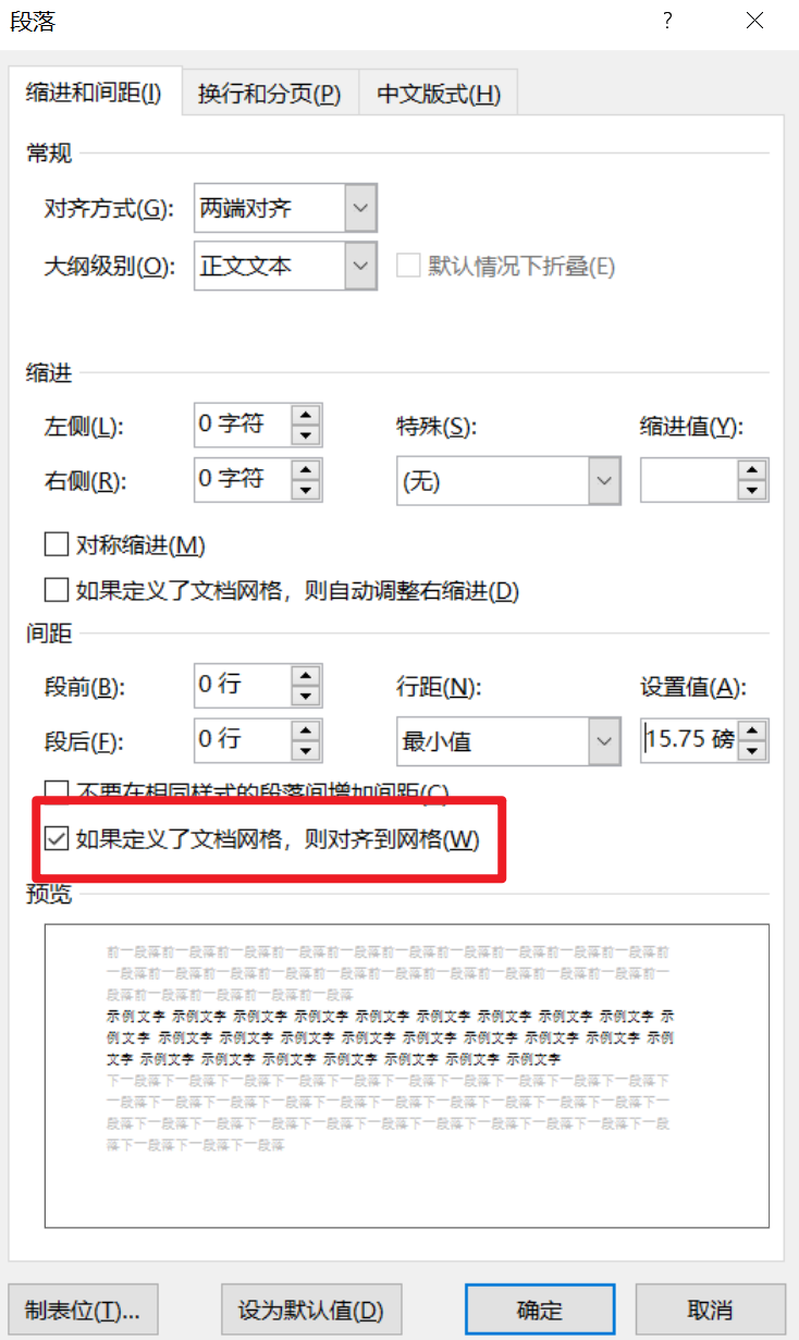 1.在写论文的时候,如果遇到在word中插入(内联)公式,我这里使用的是MathType,行距变得很大,而且调行间距没有用,这个时候只需要找到段落-缩进和间距,取消 "如果定义了文档网格,则对齐到网格(W)" 即可。