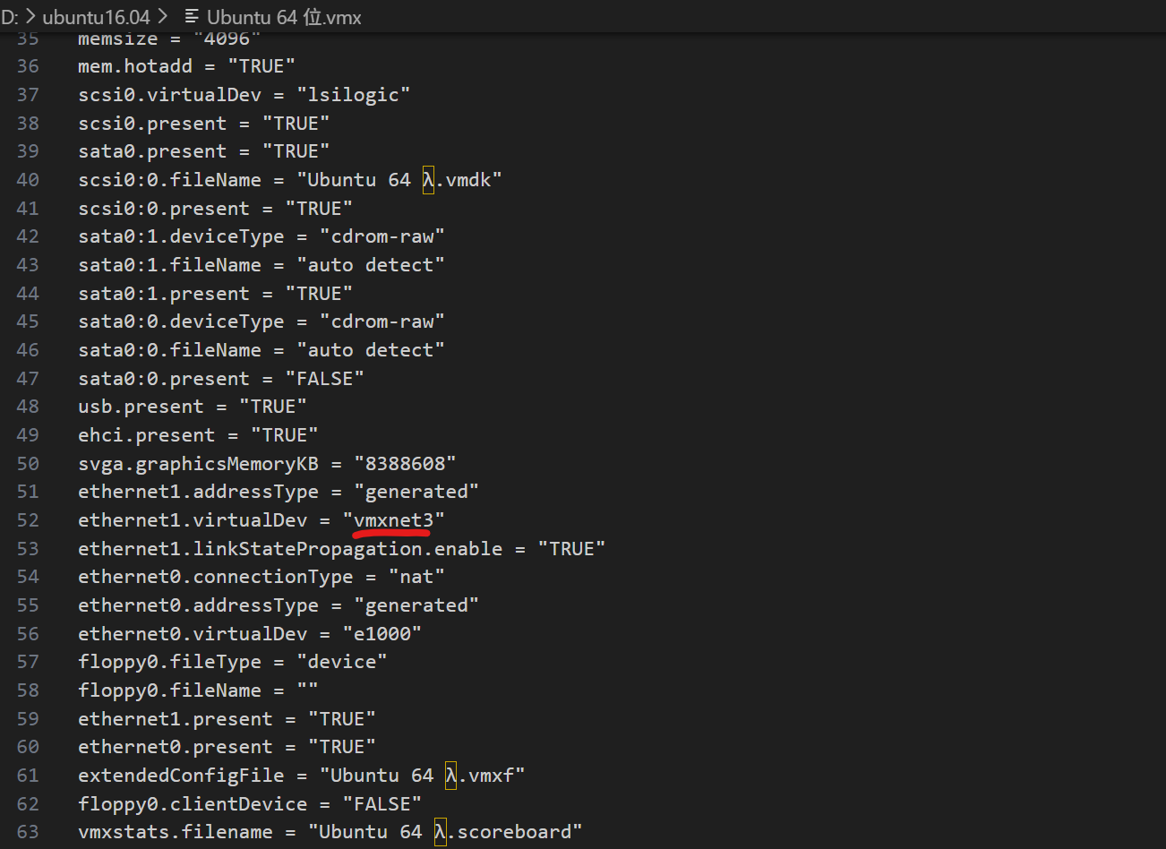 # 用文本编辑器打开.vmx文件,找到网卡配置行(通常为ethernet0)