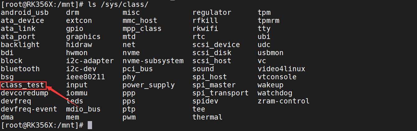 使用 ls/sys/class/ 命令查看在 class 目录下有无创建的 class_test 类。如图 所示: