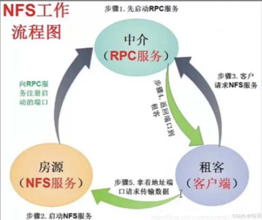 NFS 服务的正常运行依赖 NFS 服务器、RPC 服务器与客户端三者之间的协同工作,具体流程可拆解为以下 4 个关键步骤: