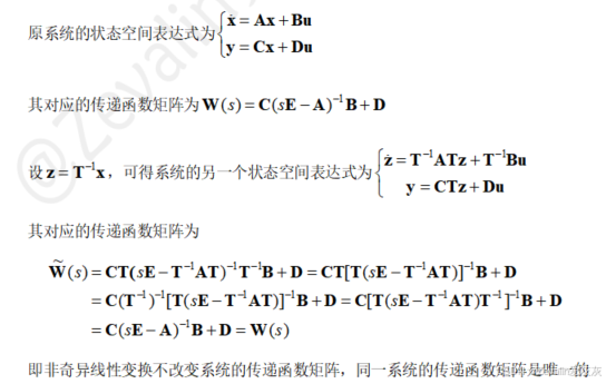 (1)一个系统的状态空间表达式是非唯一的,但其传递函数矩阵是唯一的。