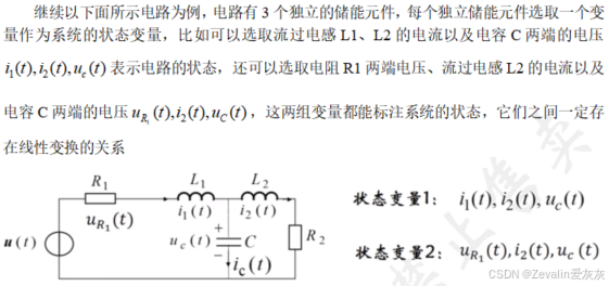 ①对于实际物理系统,状态变量的个数通常等于系统中独立储能元件的个数,因此在列写状态方程时通常可对每一个独立储能元件指定一个变量作为状态变量。