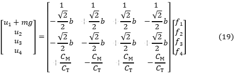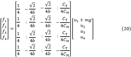 在获取到上述4个子系统后,就可以来设计LQR的飞行器系统控制器了。主要注意的是这里整个系统实际输入是4个电机的升力,其中桨叶和电机转速会有以下的关系: