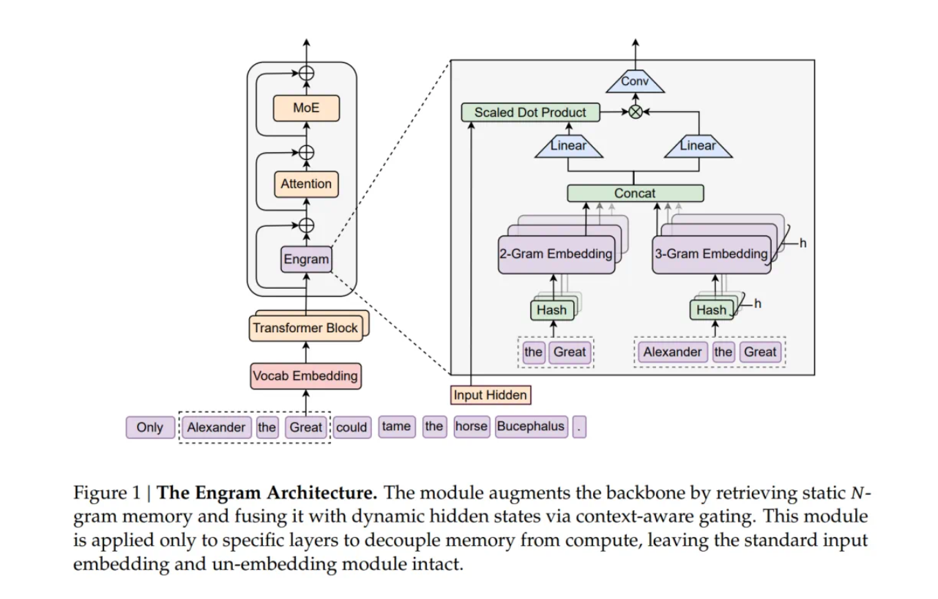 (架构图说明:Figure 1 |The Engram Architecture. The module augments the backbone by retrieving static N-gram memory and fusing it with dynamic hidden states via context-aware gating. This module is applied only to specific layers to decouple memory from compute, leaving the standard input embedding and un-embedding module intact.)架构组成:Conv、MoE、Scaled Dot Product、Linear、Attention、Concat、Engram、2-Gram Embedding、3-Gram Embedding、Hash、Transformer Block、Vocab Embedding、Input Hidden示例输入:Only Alexander the Great could tame the horse Bucephalus处理过程:the Great → Alexander the Great(通过 Hash 处理 2-Gram、3-Gram 嵌入)