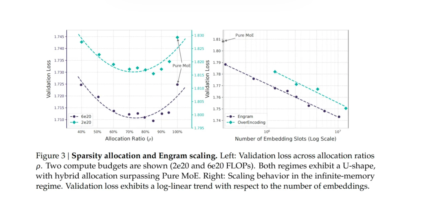 图 3(右)展示了增加内存槽数量会显著改善验证损失,并且这一改进在整个范围内持续稳定。该曲线遵循严格的幂律(在对数空间中线性),这表明 Engram 提供了一个可预测的扩展旋钮:更大的内存在不需要额外计算的情况下继续带来收益。
