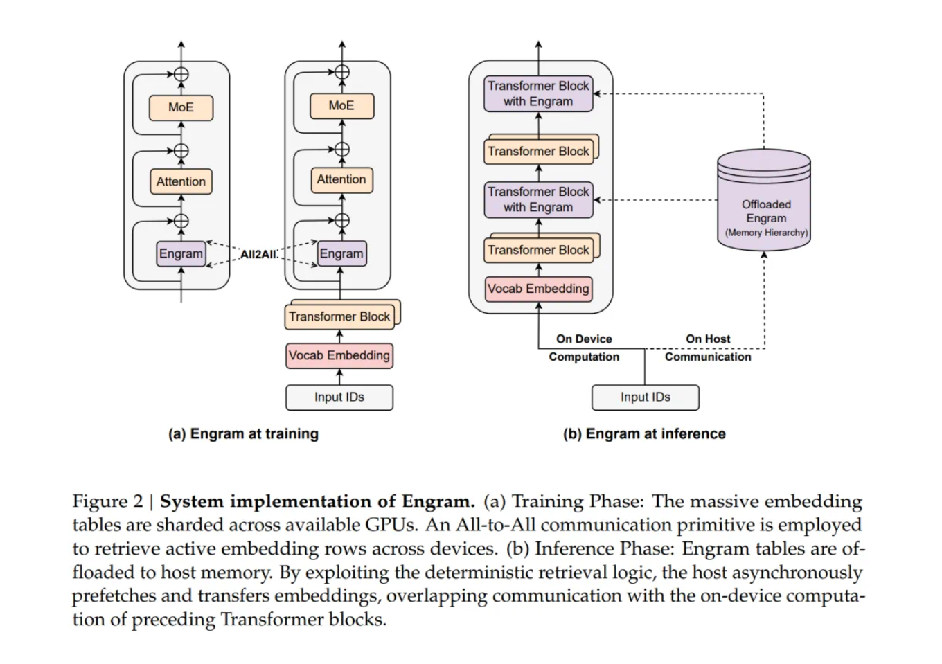 在带有记忆机制的模型中,规模扩展往往受到 GPU 高带宽显存(HBM)容量有限的制约。然而,Engram 所采用的确定性检索机制天然支持将参数存储与计算资源进行解耦。不同于 MoE 依赖运行时隐藏状态进行动态路由,Engram 的检索索引完全由输入 token 序列决定。这种可预测性使得针对训练与推理阶段的专门优化策略成为可能。