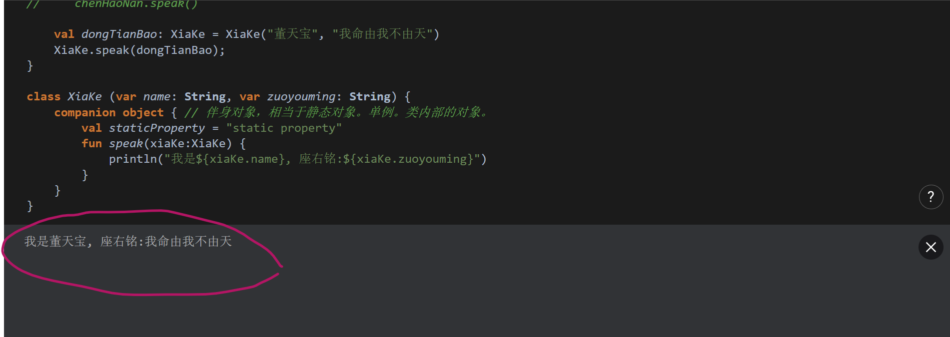 println("我是${xiaKe.name}, 座右铭:${xiaKe.zuoyouming}")