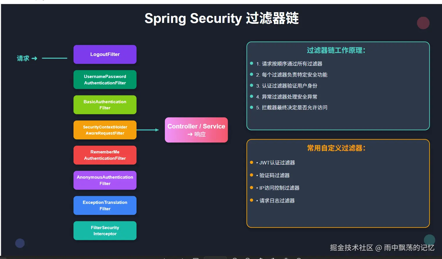 Spring Security通过过滤器链处理所有HTTP请求,理解过滤器链的工作原理对定制安全功能至关重要。