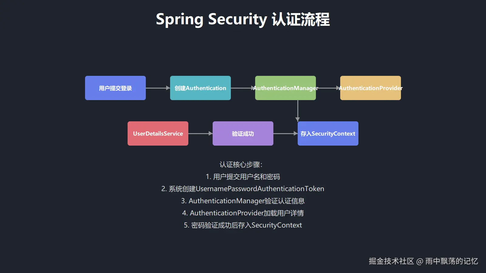 Spring Security的认证流程是一个精心设计的链式处理过程: