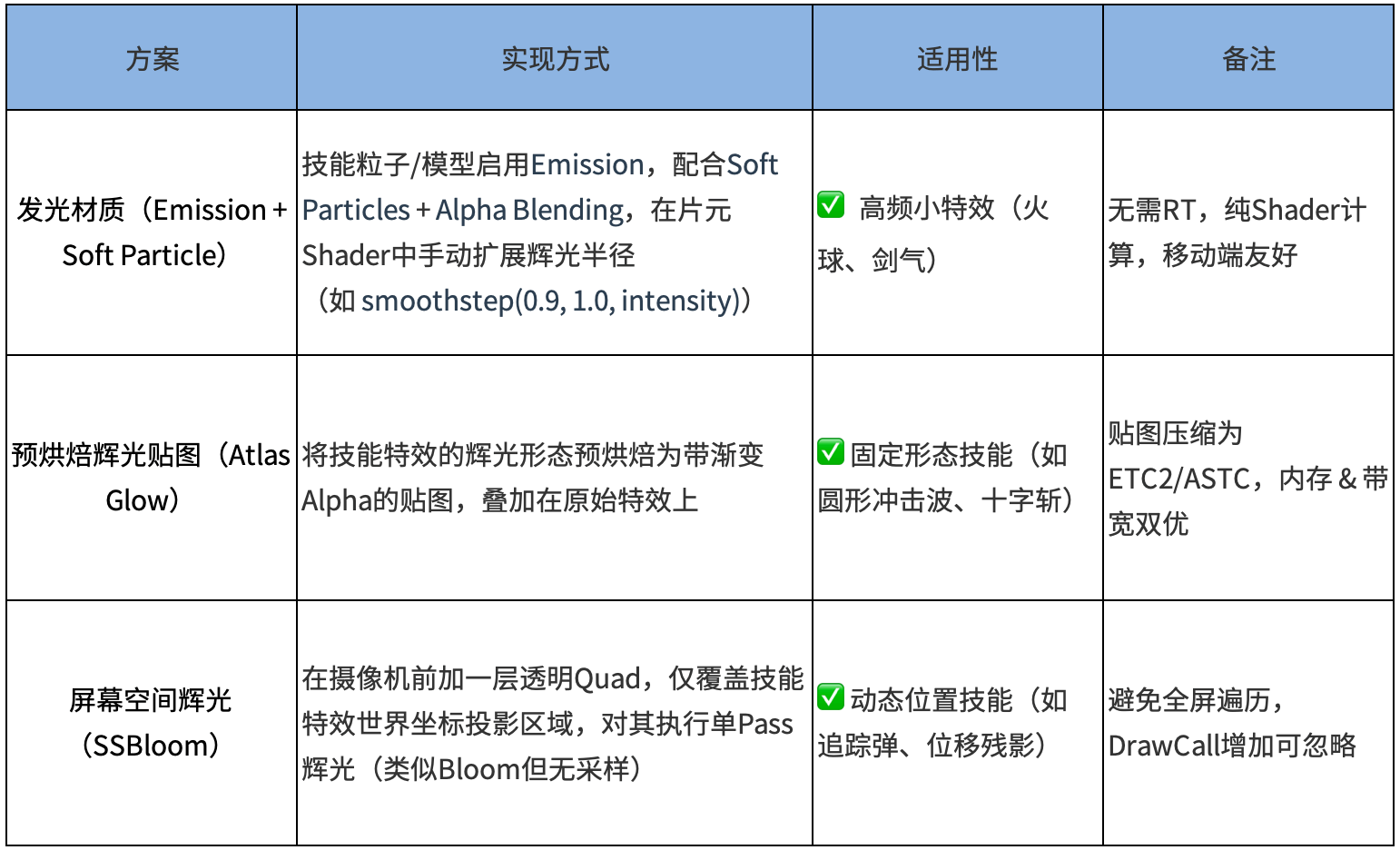 - 原理:将技能特效渲染到独立RenderTexture(带Alpha通道),用自定义Shader对其高亮区域(如亮度>0.8的像素)进行模糊+叠加。