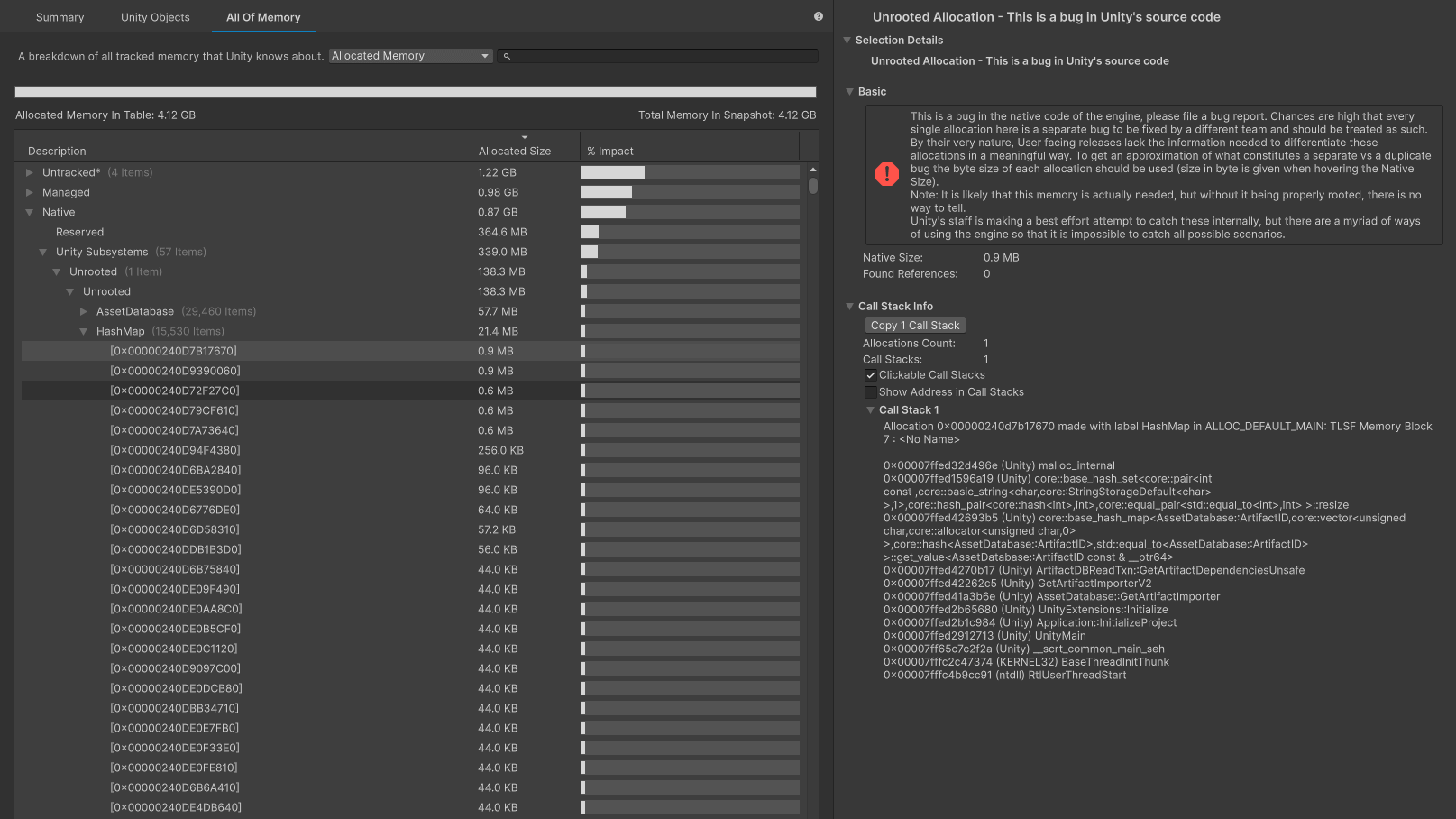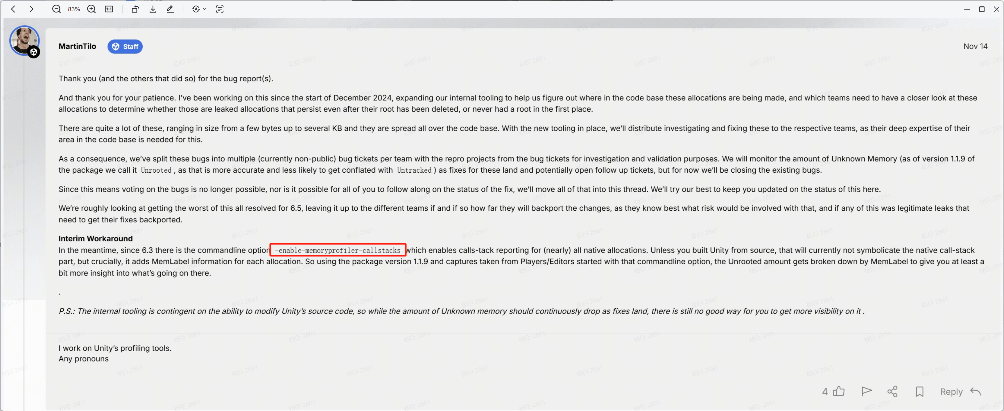 A1:最近有了解到有个办法能看到Unity Subsystem下面Unknown(Unrooted)部分中的内存类型和引用堆栈,不过需要Unity 6+Memory Profiler 1.1.9+编辑器环境,如果能够在这个条件下复现泄露问题,可能能看到更多细节:
