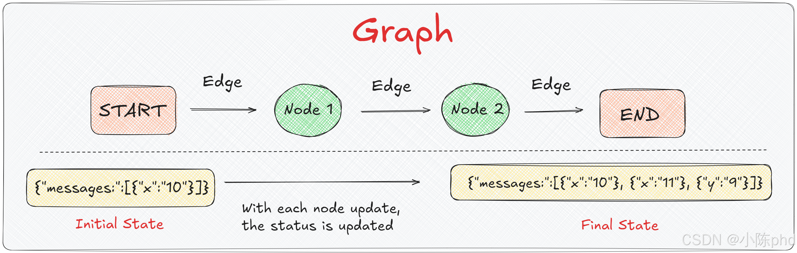 LangGraph构建的图中的每个节点都具备访问、读取和写入状态的权限。当某一个节点去修改状态时,它会将此信息广播到图中的所有其他节点。这种广播机制允许其他节点响应状态的变化并相应地调整其行为。如上图所示,从初始状态(Initial State)开始,其中包含了一条消息 { "x": "10" },随着消息在节点间通过边传递,每个节点根据其逻辑对状态进行更新。Node 1 和 Node 2 分别对状态进行了处理和变更,结果是在图的末端,我们得到了一个包含三条消息的最终状态 { "x": "10" }, { "x": "11" }, { "y": "9" }。**从开发的角度来看,State实际上是一个共享的数据结构。如上图所示,状态表现为一个简单的字典。通过对这个字典进行读写操作,可以实现自左而右的数据流动,从而构建一个可运行的图结构。那么根据前面学习的内容,我们可以利用这个流程来复现并理解图中的动态数据交换,整体的设计如下: