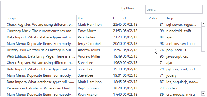 - 使用FilterGroupSortChangingEventArgs.SplitColumnFilters属性获取Tags列的过滤器,解析它并将结果分配给FilterGroupSortChangingEventArgs.SearchString 属性。