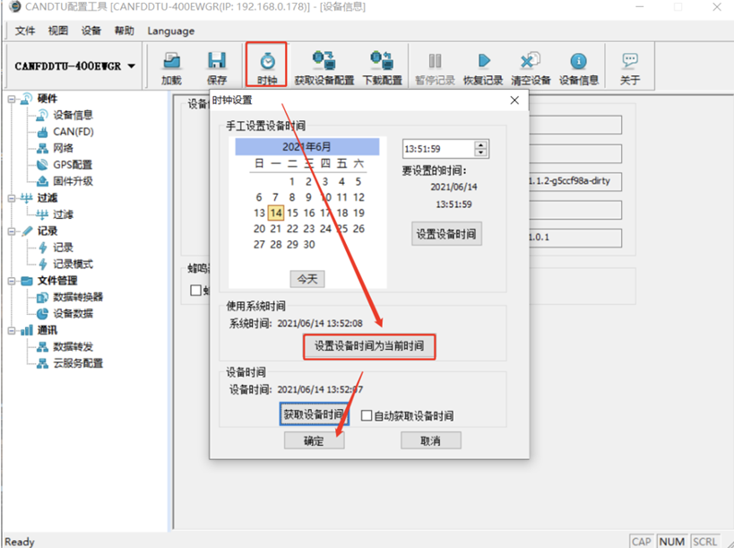 a.新硬件入手第一时间确认设备时钟,将其设为电脑时间,后续使用不需要重复执行该步骤(如果需要输入密码,密码为:88888)。