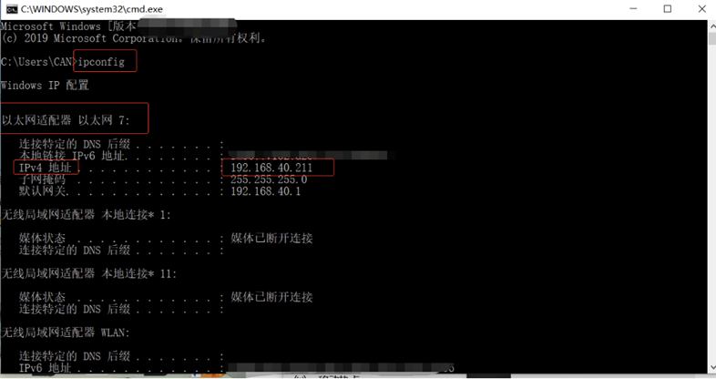 如图所示,此测试电脑的以太网网口ip为192.168.40.211