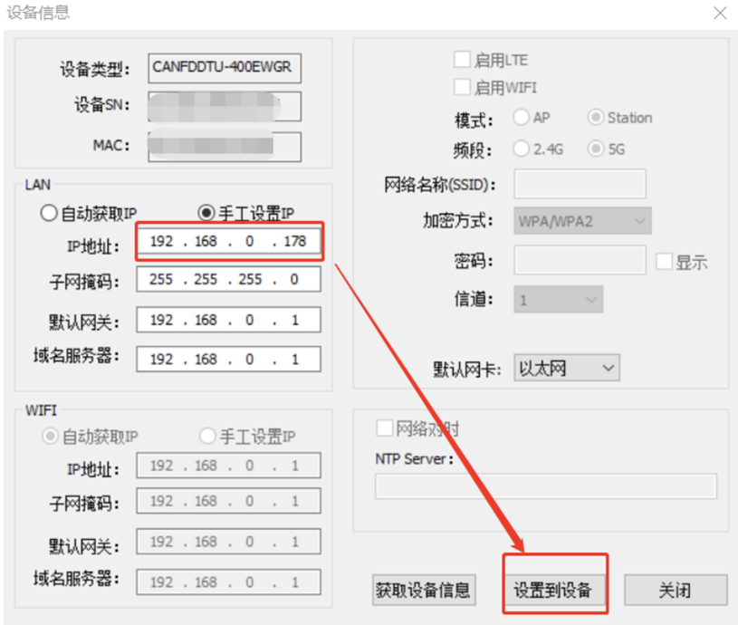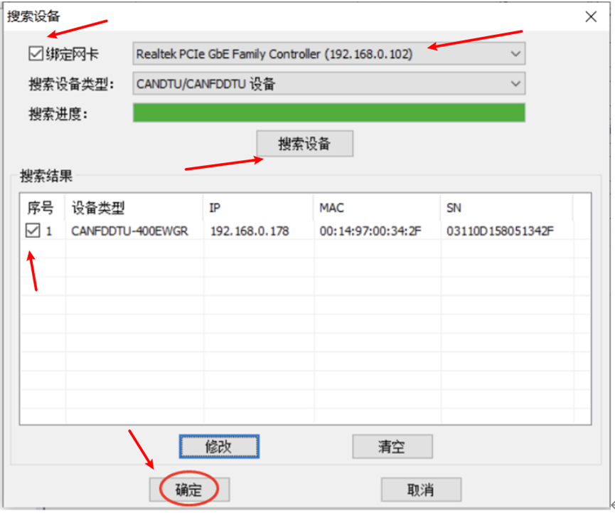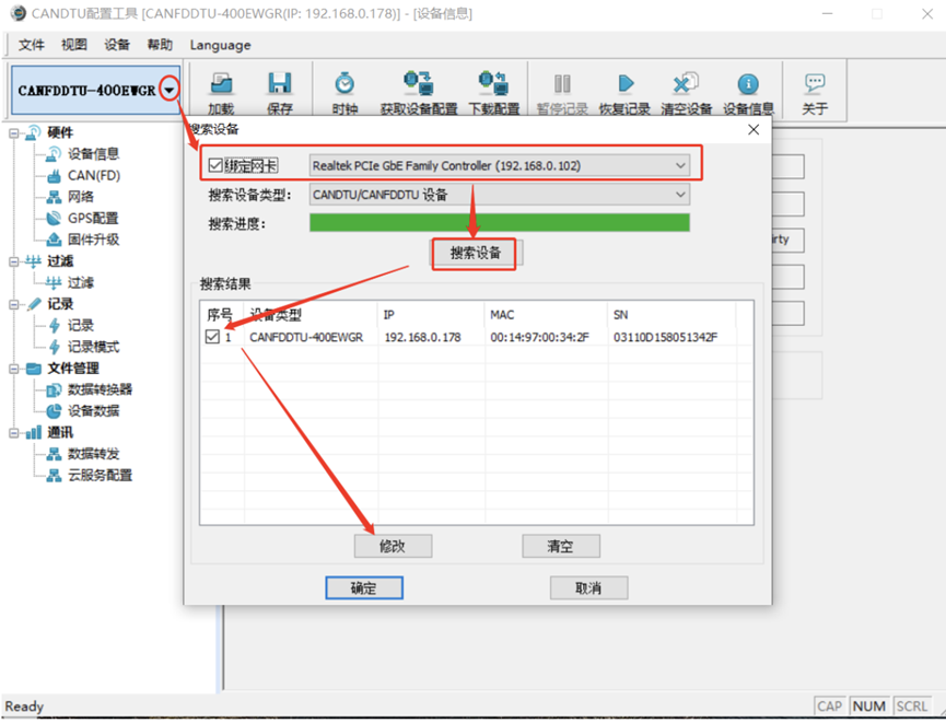 a.设备上电,以太网口网线连PC,或与PC连在同一个局域网内,打开配置工具,选择设备,选择【CANDTU网络设备】操作如下