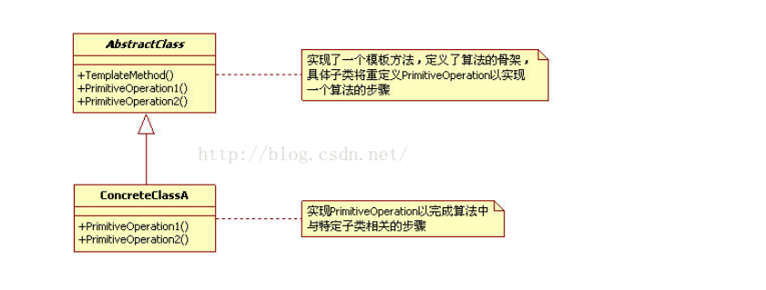 抽象类(AbstractClass):抽象类实现了模板方法,定义了算法的框架,其中的方法可以是具体方法也可以是抽象方法(其中抽象方法称为基本操作,算法的框架称为模板方法)