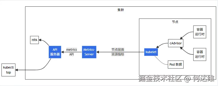 kubectl top命令(查看资源使用)和HorizontalPodAutoscaler(HPA,自动扩缩容)提供数据支持。
