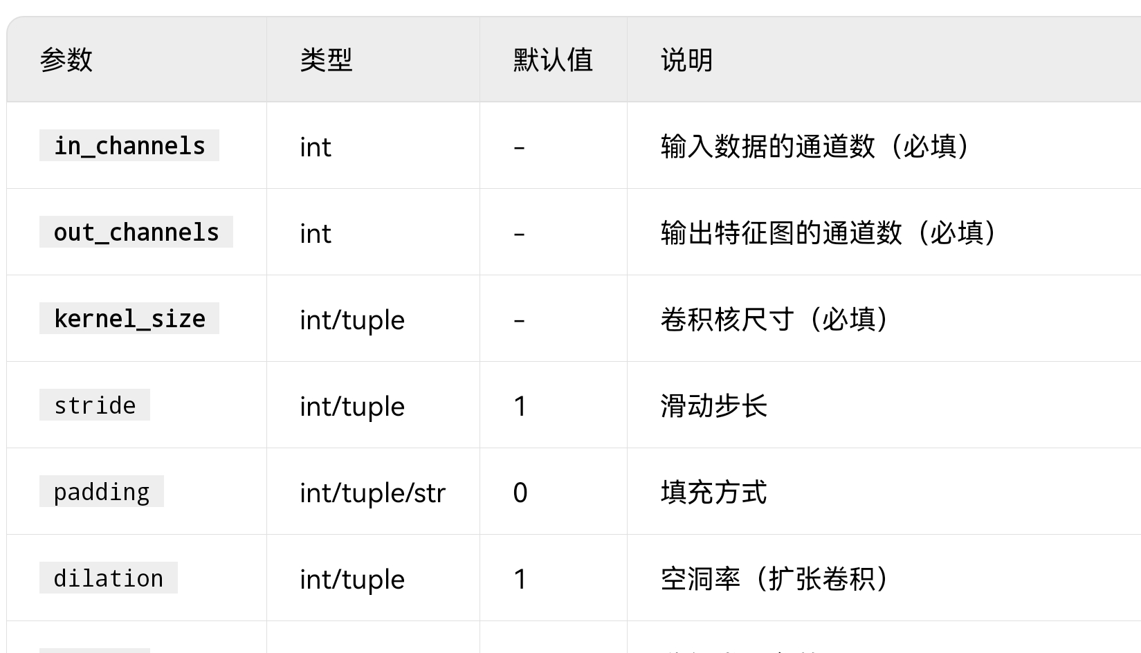 步长(stride):卷积核每次移动的像素数。步长大,输出尺寸小。