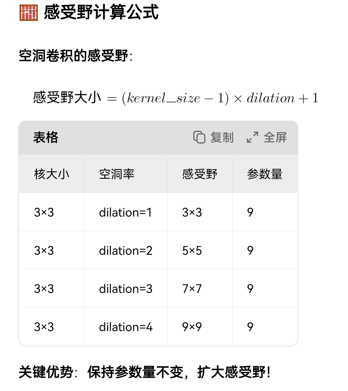 就像用放大镜看东西:镜片大小不变(参数量不变),但能看到更大的范围(感受野增大)!