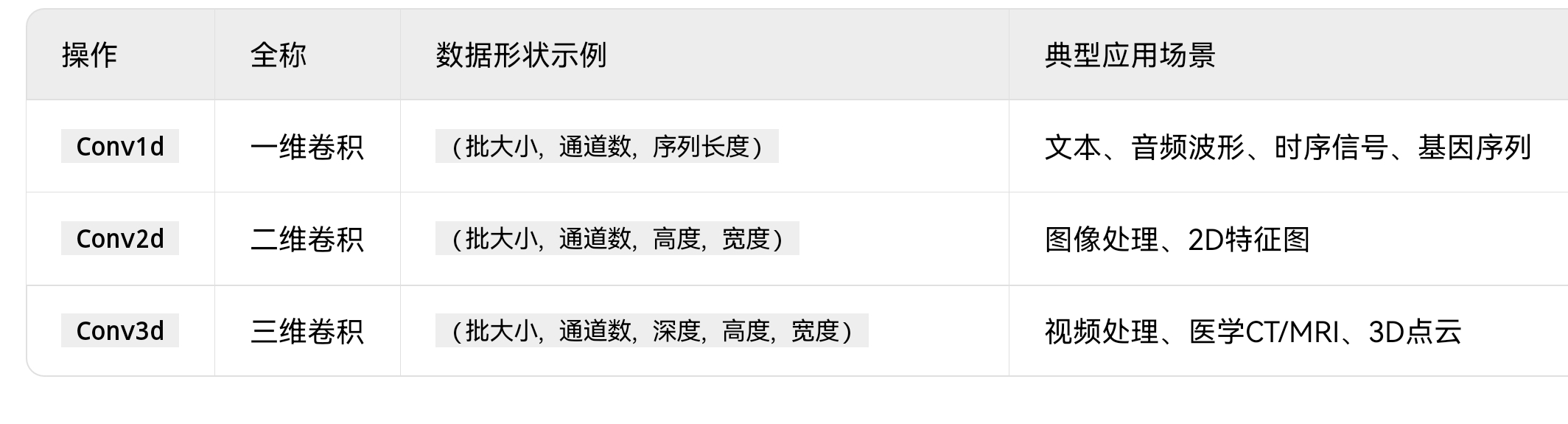 Conv3d → 三维卷积(如视频/医学体积数据)